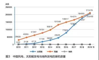 近10年,中國風(fēng)電、太陽能發(fā)電裝機(jī)保持快速增長態(tài)勢。2019年,非化石能源發(fā)電裝機(jī)占總裝機(jī)容量的41%,風(fēng)電和太陽能發(fā)電裝機(jī)容量之和達(dá)40萬兆瓦以上,地?zé)醿H49兆瓦(見圖3)。在太陽能、風(fēng)電等已獲先發(fā)優(yōu)勢的條件下,發(fā)揮地?zé)岚l(fā)電的后發(fā)優(yōu)勢,是增強(qiáng)風(fēng)電、太陽能發(fā)電供應(yīng)穩(wěn)定性的有利選擇。