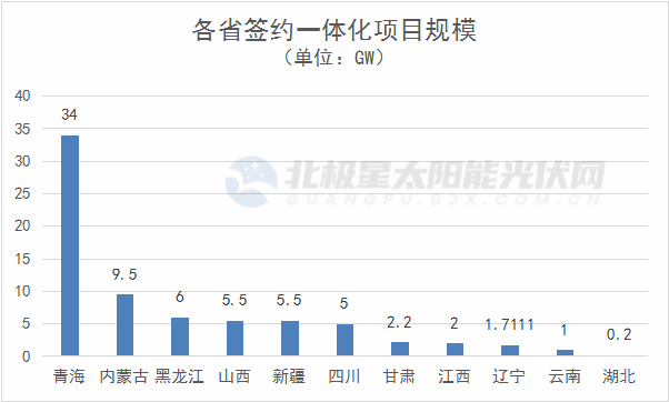 黑龍江、山西、新疆、四川則不分伯仲,簽約一體化項目規(guī)模在5GW~6GW之間。