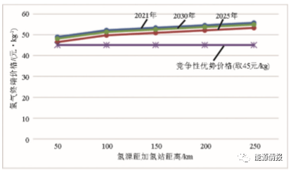 從氫能產(chǎn)業(yè)鏈中制氫、運(yùn)氫、加注3個環(huán)節(jié)(含儲氫)的費(fèi)用出發(fā),分析氫氣終端價格在一定運(yùn)輸范圍內(nèi)的變化趨勢。