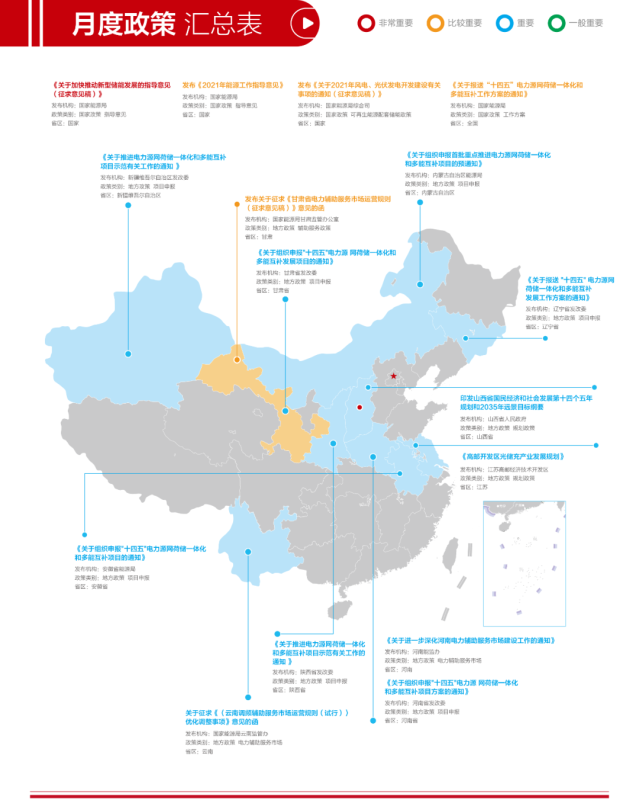 地方層面,山西省在印發(fā)的《國民經(jīng)濟(jì)和社會(huì)發(fā)展第十四個(gè)五年規(guī)劃和2035年遠(yuǎn)景目標(biāo)綱要》中提出了依托晉能控股等集團(tuán),探索大容量、高參數(shù)煤電項(xiàng)目與風(fēng)電、光伏、儲(chǔ)能項(xiàng)目一體化布局;推進(jìn)國網(wǎng)時(shí)代大同集中式獨(dú)立儲(chǔ)能項(xiàng)目、隆基“光伏 + 儲(chǔ)能”平價(jià)示范項(xiàng)目、啟迪清能云岡礦壓縮空氣儲(chǔ)能項(xiàng)目等。甘肅發(fā)布了《甘肅省電力輔助服務(wù)市場(chǎng)運(yùn)營規(guī)則(征求意見稿)》,自2020年1月發(fā)布《甘肅省電力輔助服務(wù)市場(chǎng)運(yùn)營暫行規(guī)則》以來,甘肅的調(diào)頻市場(chǎng)規(guī)模擴(kuò)大,調(diào)峰補(bǔ)償規(guī)模急劇縮小,調(diào)頻收益被市場(chǎng)看好。最新發(fā)布的《征求意見稿》中,調(diào)頻輔助服務(wù)補(bǔ)償價(jià)格由上限15元/MW下調(diào)至12元/MW。調(diào)峰輔助服務(wù)申報(bào)價(jià)格非現(xiàn)貨期間為0.5元/kWh,現(xiàn)貨期間為0.3元/kWh。調(diào)整后的價(jià)格對(duì)市場(chǎng)收益的影響還需進(jìn)一步跟蹤測(cè)算,調(diào)峰市場(chǎng)與現(xiàn)貨市場(chǎng)如何融合以及儲(chǔ)能參與電能量市場(chǎng)如何獲益還未能明確。此外文件要求雙邊協(xié)議中應(yīng)明確充電電量、充電電價(jià)、儲(chǔ)能轉(zhuǎn)換損耗分?jǐn)?、網(wǎng)損分?jǐn)?、輔助服務(wù)費(fèi)用分配原則及費(fèi)用結(jié)算方式等條款,相關(guān)條款仍需政府部門進(jìn)一步明確細(xì)則。