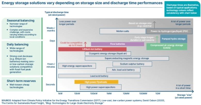 因此需要部署更多的儲能系統(tǒng)。而儲能系統(tǒng)的范圍很廣泛,從對電網(wǎng)的接近實時和日常管理的快速響應(yīng)選項,到滿足不可預(yù)測的每周變化和供需的季節(jié)性變化而提供的持續(xù)更長放電時間的選項。