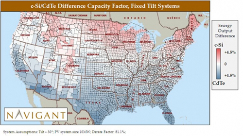 圖1:美國c-Si和CdTe固定傾斜系統(tǒng)能源輸出差異比較