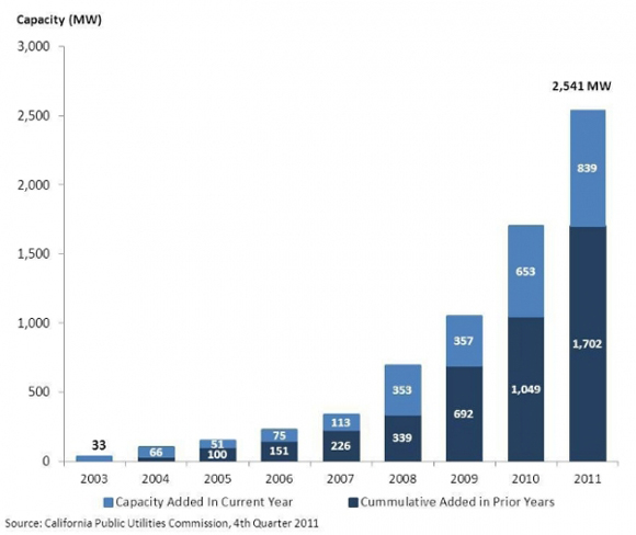 “在過去的兩年中價格較高,企業(yè)紛紛創(chuàng)新,成功降低了成本。鑒于成本下降過多,因此眾多商業(yè)模型都不再適用,因為價格已經(jīng)下降到他們無法再提供合適的解決方案的地步。我們看到新興安裝企業(yè)和其它小型公司漸漸萎縮,部分原因是受到資本市場的限制。某些公司現(xiàn)在正掙扎在投資競爭和擴(kuò)大規(guī)模之間,投資者減少投資是因為他們投資的回報達(dá)不到預(yù)期水平。價格下降如此之多要感謝中國企業(yè),您可以認(rèn)為這對行業(yè)有好處,但大量商業(yè)模型和新技術(shù)已經(jīng)不足以讓投資者冒險投入大筆資金。便宜的中國進(jìn)口產(chǎn)品據(jù)稱也決定著加州投標(biāo)將產(chǎn)生價格戰(zhàn),從而導(dǎo)致2011年的懇請,價格低到7美分,是實(shí)現(xiàn)2020年33%可再生能源目標(biāo)所需的競標(biāo)數(shù)四倍。加州公共事業(yè)委員會RPS的2011年第四季度報告稱,2011年830MW以上的可再生能源產(chǎn)量上線。但盡管CPUC受法律制約必須將RPS的競標(biāo)盡量向外界開放,但對于開發(fā)商建設(shè)項目的價格仍保持小心謹(jǐn)慎。根據(jù)平均交付時間加權(quán)調(diào)整的所有合同的成本從2003年的5.4美分到2011年的13.3美分。所有合同加權(quán)平均值約為11.9美分。最近,2011年RPS懇請中的競標(biāo)雖然并未包含在報告中,但卻顯示出巨額的成本下降,這將反映在未來投資者所有的公共設(shè)施項目合同中。”