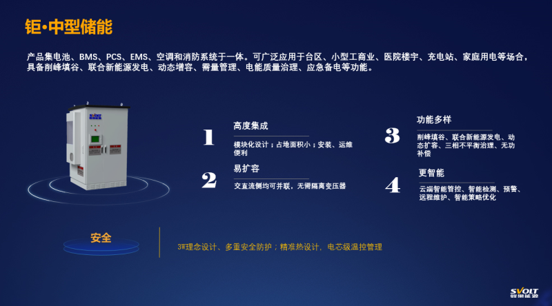 產(chǎn)品集電池、BMS、PCS、EMS、空調(diào)和消防系統(tǒng)于一體??蓮V泛應(yīng)用于臺(tái)區(qū)、小型工商業(yè)、醫(yī)院樓宇、充電站、家庭用電等場(chǎng)合,具備削峰填谷、聯(lián)合新能源發(fā)電、動(dòng)態(tài)增容、需量管理、電能質(zhì)量治理、應(yīng)急備電等功能。