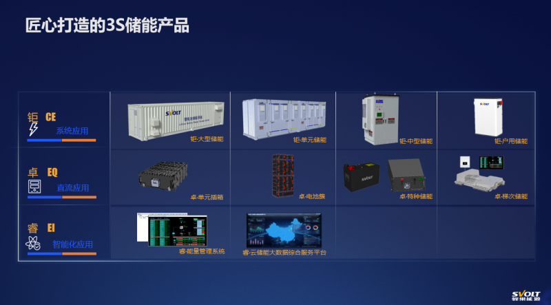 基于3S儲(chǔ)能理念,蜂巢能源推出鉅、卓、睿三大儲(chǔ)能系列產(chǎn)品,包含系統(tǒng)級(jí)應(yīng)用的大型、單元、中型、戶用、移動(dòng)儲(chǔ)能;面向直流應(yīng)用的電池簇、基站、房車等特種電源及梯次儲(chǔ)能產(chǎn)品;智能化方面,開(kāi)發(fā)了面向區(qū)域能源的能量管理系統(tǒng)和云儲(chǔ)能大數(shù)據(jù)綜合服務(wù)平臺(tái)。