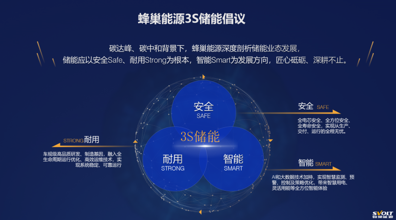 在儲(chǔ)能方面,蜂巢能源系統(tǒng)性思考和剖析能源業(yè)態(tài)發(fā)展,結(jié)合自身車規(guī)級(jí)“質(zhì)”造和大數(shù)據(jù)AI發(fā)展優(yōu)勢(shì),為行業(yè)提出了3S儲(chǔ)能發(fā)展理念,儲(chǔ)能應(yīng)以安全Safe、耐用Strong為根本,智能Smart為發(fā)展方向。該理念自提出以來(lái)得到了行業(yè)的廣泛好評(píng)和認(rèn)可。