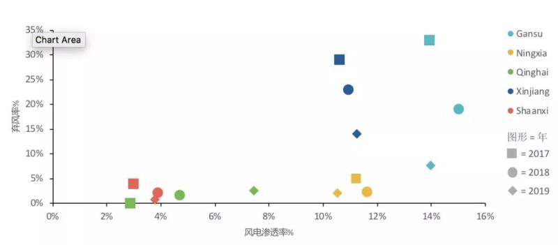 盡管寧夏的風(fēng)電滲透率很高,然而,一定程度上鑒于以上工作,在2017-2019年期間仍保持了較低的棄風(fēng)率。同期間,甘肅和新疆的棄風(fēng)棄光顯著下降,盡管這兩個省仍然是中國棄風(fēng)率最高的省。同時,新疆和青海的棄光率在2019年超過7%。這些省份的高棄電率表明該地區(qū)在管理棄電方面面臨著持續(xù)挑戰(zhàn)。