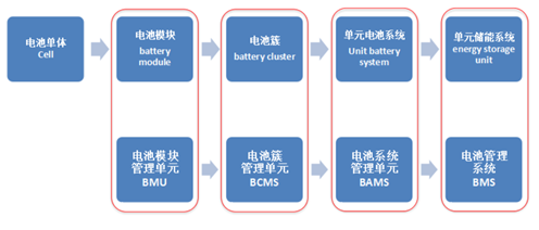 本部分主要按照以鉛酸電池、鋰離子電池、液流電池等電化學(xué)儲能電池的結(jié)構(gòu)方式給出了術(shù)語定義,從儲能系統(tǒng)的構(gòu)成上從小到大包括電池單體、電池模塊、電池簇、單元電池系統(tǒng)、單元儲能系統(tǒng),與之對應(yīng)的管理系統(tǒng)分別是電池模塊管理單元、電池簇管理單元、電池系統(tǒng)管理單元、電池管理系統(tǒng)。標準中后續(xù)對儲能系統(tǒng)的標識編碼也是按上述層級展開的。