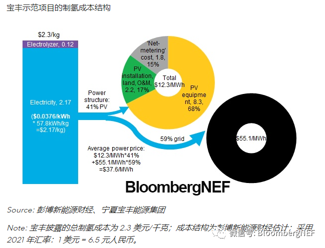寶豐計劃成立一家專注于綠色制氫的子公司。未來寶豐將提高光伏和電解槽之間的容量比,最終實現(xiàn)完全“綠色”制氫。寶豐預(yù)計其未來的綠氫生產(chǎn)成本會降至每千克1.2美元,基于一個重要的假設(shè):將電網(wǎng)當(dāng)作一個虛擬儲能電池來為光伏發(fā)出的電做存儲和釋放的成本為每兆瓦時15.4美元。彭博新能源財經(jīng)認為,這個假設(shè)長期看來過于樂觀,寶豐的預(yù)期綠氫成本有可能被低估。