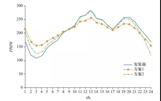 安裝ESPS后,可起到削峰填谷的作用,如圖5所示。在安裝ESPS前,系統(tǒng)的負(fù)荷在2:00—5:00較低,處于整個(gè)負(fù)荷曲線的谷值;而在10:00—16:00以及19:00—22:00這兩個(gè)時(shí)間段負(fù)荷較高,處于整個(gè)負(fù)荷曲線的峰值。當(dāng)安裝ESPS后,由于ESPS的調(diào)峰作用,2:00—5:00的實(shí)際負(fù)荷升高,而10:00—16:00以及19:00—22:00的實(shí)際負(fù)荷降低,使得整條負(fù)荷曲線變得較平穩(wěn)。