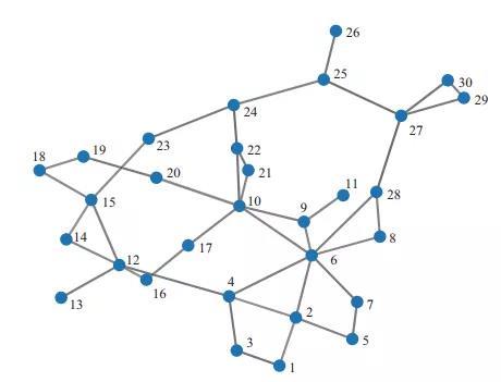 ? 圖2 IEEE30節(jié)點(diǎn)系統(tǒng)復(fù)雜網(wǎng)絡(luò)圖