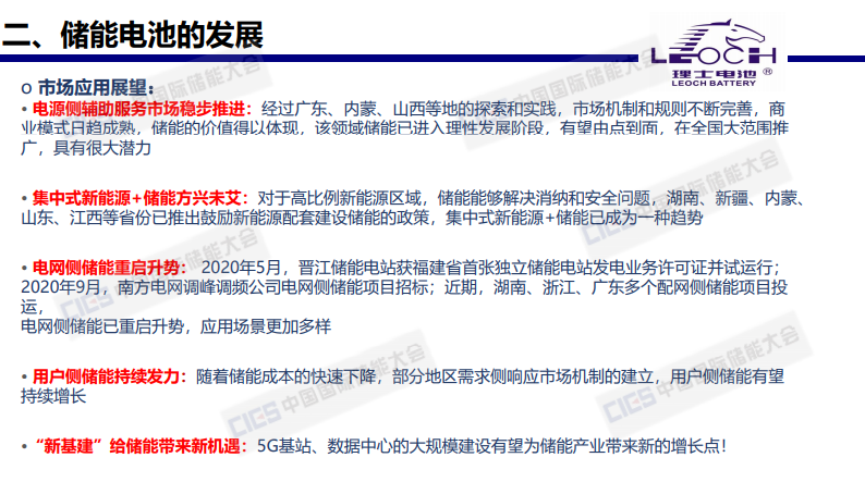 市場應用的展望:第一,電源側輔助服務市場穩(wěn)步推進。第二,集中式新能源+儲能方興未艾。第三,電網(wǎng)側儲能重啟升勢。第四,用戶側儲能持續(xù)發(fā)力。第五,新基建給儲能帶來新機遇。