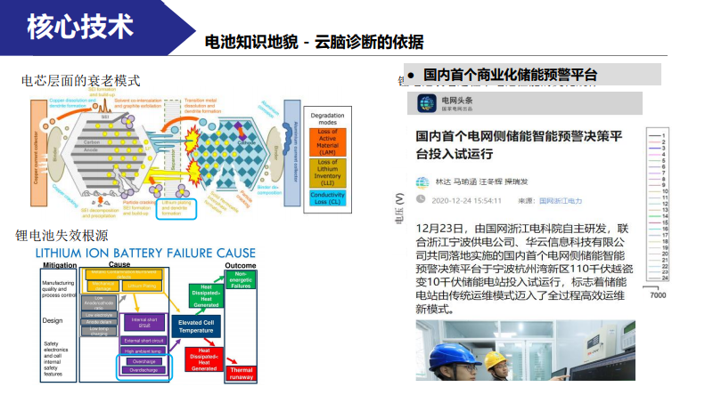 我們判斷鋰電池衰老到什么程度該讓其退役呢?依據(jù)是啥?實際上整個學術界和產(chǎn)業(yè)界對鋰電池的理解還非常淺薄,我們只是知道一些知識地貌,比如說衰老有多種模式和不同的根源并且都是隨機的。在充電過程中要是太快并在較低的溫度就容易在負極上析鋰,析鋰嚴重就會形成枝晶,而枝晶長大戳破薄膜就會導致內(nèi)短路,短路過程中釋放大量能量導致熱失控、熱蔓延等等。你可能會問,具體來說你有辦法提前判斷嗎?我們對老化鋰電池的測試中發(fā)現(xiàn)幾種微短路先兆的案例。一般正常情況下,充電過程中電壓是單調(diào)上升的,如果你看到某個電芯往下走了,這就是一個微短路先兆的案例之一。我們用這種方法跟浙江華云合作,在國網(wǎng)頭條里面有他們第一個國內(nèi)首個商業(yè)化儲能運行平臺就是我們幫他實現(xiàn)的。