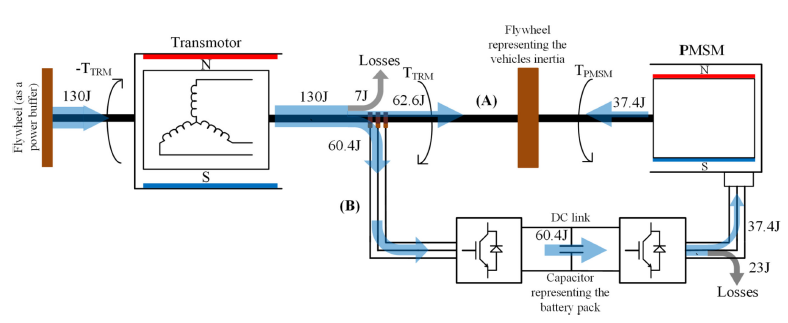 技術(shù)突破:提出了一種基于飛輪動(dòng)能回收系統(tǒng)的新型全輪驅(qū)動(dòng)電動(dòng)動(dòng)力系統(tǒng),實(shí)例分析表明,與傳統(tǒng)的基于永磁同步電機(jī)的動(dòng)力系統(tǒng)相比,該系統(tǒng)在加速/減速過(guò)程中將電化學(xué)存儲(chǔ)量降至零,可以提高動(dòng)力系統(tǒng)的效率和電池壽命。