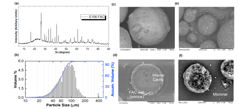 圖1 用于微膠囊化的空心粉煤灰微珠(FAC)和微米級(jí)MEPCM的性能: (a) X射線衍射(XRD);(b) 粒度分布;(c) FAC表面形貌掃描電鏡圖像;(d) FAC的多孔壁結(jié)構(gòu) (e) 微粒團(tuán) (f)單個(gè)顆粒的放大圖
