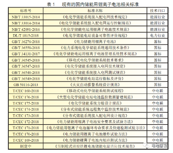 2014年對(duì)口IEC/TC120的全國(guó)電力儲(chǔ)能標(biāo)準(zhǔn)化技術(shù)委員會(huì)(SAC/TC550)成立,負(fù)責(zé)電力儲(chǔ)能領(lǐng)域標(biāo)準(zhǔn)化體系的建立及相關(guān)標(biāo)準(zhǔn)的制定工作。國(guó)內(nèi)鋰電儲(chǔ)能相關(guān)標(biāo)準(zhǔn)見(jiàn)表1。