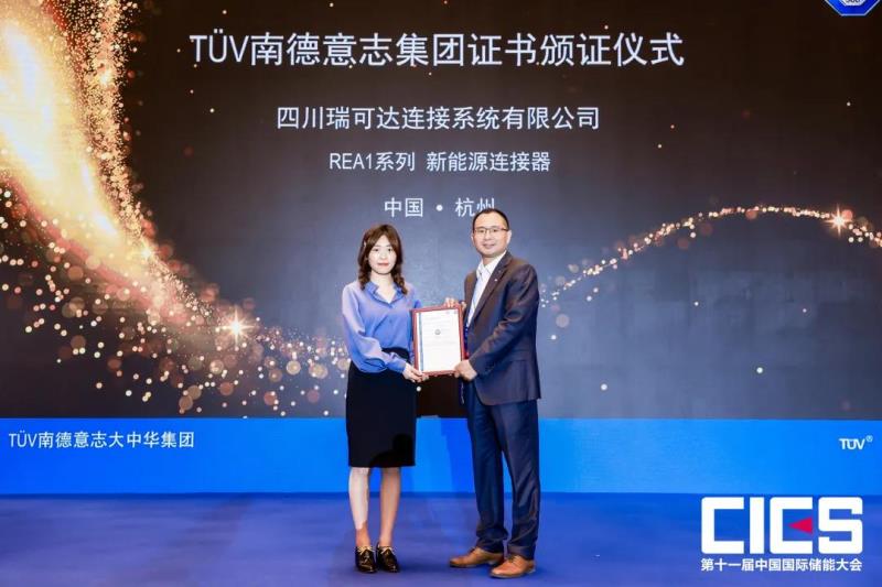四川瑞可達(dá)連接系統(tǒng)有限公司(以下簡(jiǎn)稱“瑞可達(dá)”)項(xiàng)目經(jīng)理左鳳瓊女士出席了頒證儀式。該證書(shū)的獲得標(biāo)志著瑞可達(dá)該儲(chǔ)能系統(tǒng)專用連接器產(chǎn)品的安全性、可靠性符合歐洲市場(chǎng)的安規(guī)要求,為其扎根儲(chǔ)能領(lǐng)域,順利進(jìn)入國(guó)際市場(chǎng)增添競(jìng)爭(zhēng)力;同時(shí)也彰顯了TüV南德在新能源儲(chǔ)能系統(tǒng)國(guó)際標(biāo)準(zhǔn)規(guī)范編制中的權(quán)威性及影響力。