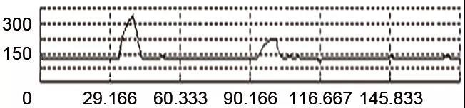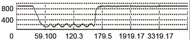 圖10的波形是正端竄入交流電壓后的情況,電壓出現(xiàn)下跌,并出現(xiàn)交流成分。時(shí)標(biāo)37.5 mS時(shí)竄入交流電壓,165.5 mS后交流竄入消失,電壓恢復(fù)正常。