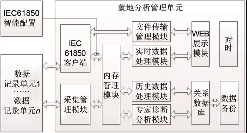 人機(jī)交互采用WEB方式展示波形和運(yùn)行信息;數(shù)據(jù)庫(kù)保存儲(chǔ)能艙長(zhǎng)期運(yùn)行數(shù)據(jù),為專家診斷分析模塊提供數(shù)據(jù)支撐;采集管理模塊作為數(shù)據(jù)記錄單元信息接入接口。就地分析管理單元的框圖如圖7所示。