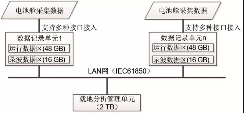 鋰電池儲(chǔ)能艙一般容量均超過(guò)1 MW·h,目前已可以做到3 MW·h容量,艙內(nèi)多達(dá)上千個(gè)乃至上萬(wàn)個(gè)單體鋰離子電芯,儲(chǔ)能系統(tǒng)的異常一般由個(gè)別單體異常引起,而單體電池的異常往往發(fā)生在最高幾節(jié)、最低幾節(jié)或突變的幾節(jié)上。所以異常發(fā)生時(shí),每簇單體電池的最高若干節(jié)(如最高5節(jié))、最低若干節(jié)(如最低5節(jié))和變化最大的若干節(jié)(如變化最大的5節(jié))需要實(shí)時(shí)記錄;電池堆端和簇端電壓、電流、絕緣同步實(shí)時(shí)記錄;PCS側(cè)交流、直流量通過(guò)通訊或數(shù)據(jù)記錄單元實(shí)時(shí)采集和記錄;煙感、水浸等消防變位和艙內(nèi)環(huán)境溫濕度根據(jù)系統(tǒng)配置情況同步記錄;各系統(tǒng)的告警狀態(tài)、接觸器和斷路器的位置狀態(tài)作為重要的事故分析依據(jù)也實(shí)時(shí)記錄。除此之外還可以根據(jù)儲(chǔ)能艙的具體配置情況增加故障記錄通道。