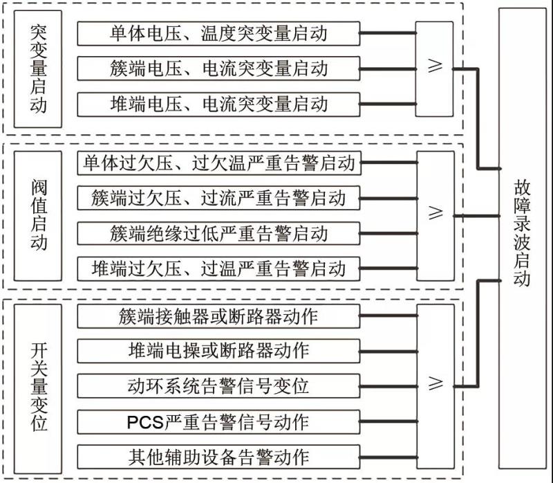 本系統(tǒng)覆蓋儲(chǔ)能艙內(nèi)各類故障及異常情況,啟動(dòng)判據(jù)主要考慮以下幾種情況:?jiǎn)误w電池電壓/溫度異常、電池簇端電壓/電流異常、電池堆端電壓/電流異常、儲(chǔ)能系統(tǒng)絕緣異常、消防動(dòng)環(huán)告警、PCS告警、儲(chǔ)能艙內(nèi)各開(kāi)關(guān)動(dòng)作、充放電啟動(dòng)等。本系統(tǒng)支持三種方式的故障錄波啟動(dòng)判斷:突變量啟動(dòng)、閥值啟動(dòng)、開(kāi)關(guān)量變化啟動(dòng),故障錄波啟動(dòng)判斷邏輯見(jiàn)圖4。