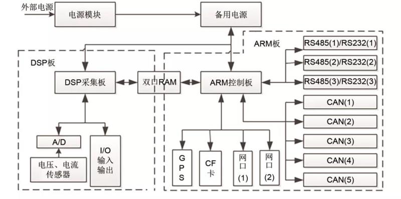 數(shù)據(jù)記錄單元由電流傳感器、電壓傳感器、AD調(diào)理電路、開(kāi)關(guān)量采集電路、DSP數(shù)據(jù)采集板、ARM控制板,從接入信息的多樣性和通訊實(shí)時(shí)性考慮,數(shù)據(jù)記錄單元有多個(gè)通道的通訊接口。