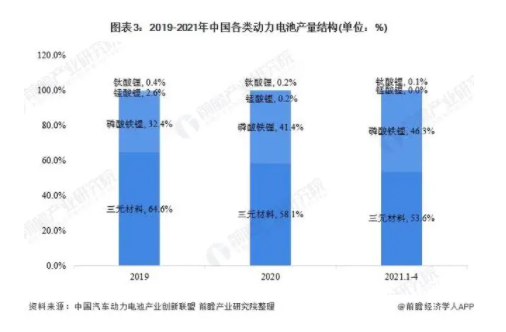 從各類材料的動(dòng)力電池產(chǎn)量來(lái)看,三元電池是我國(guó)產(chǎn)量最多的電池類型,但三元電池占比在逐漸減小。2019-2021年4月,我國(guó)三元電池占比從64.6%降至53.6%;而磷酸鐵鋰電池占比在逐漸增大,從32.4%增至46.3%。