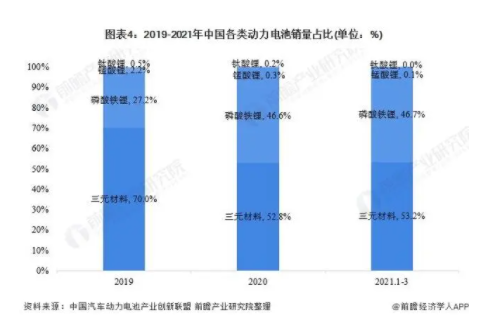 從銷量占比來(lái)看,2019-2021年3月,我國(guó)磷酸鐵鋰電池的銷量占比在逐步擴(kuò)大,從27.2%增至46.7%。