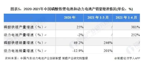 從產(chǎn)銷量增速來(lái)看,磷酸鐵鋰電池產(chǎn)銷量增速高于行業(yè)整體增速水平。2020年,全國(guó)動(dòng)力電池產(chǎn)銷量均有所下降,但磷酸鐵鋰電池產(chǎn)銷量卻有所增長(zhǎng);2021年1-4月,磷酸鐵鋰電池產(chǎn)量達(dá)21.2GWh,同比累計(jì)增長(zhǎng)381%;2021年1-3月,我國(guó)磷酸鐵鋰電池累計(jì)銷售11.1GWh,同比累計(jì)增長(zhǎng)246%。