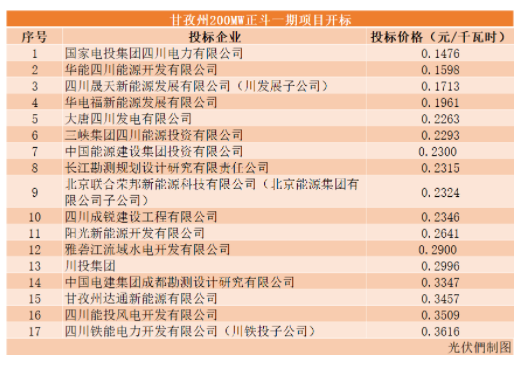 在17家參與投標(biāo)的企業(yè)中,國家電投、華電、三峽、大唐國家開發(fā)投資集團(tuán)以及中國能建、中國電建等電力投資央企悉數(shù)到場。此外,以晟天新能源、四川能投、四川鐵投、川投集團(tuán)、甘孜州達(dá)通新能源等為代表的四川本地國有企業(yè)也深度參與其中。值得強調(diào)的是,此次僅有陽光新能源、四川成銳建設(shè)兩家民營企業(yè)參與。隨著平價時代,各省光伏投資產(chǎn)業(yè)配套要求持續(xù)加碼,光伏電站投資開發(fā)領(lǐng)域民營企業(yè)占比進(jìn)一步縮小。以下是投標(biāo)企業(yè)報價(由低到高):