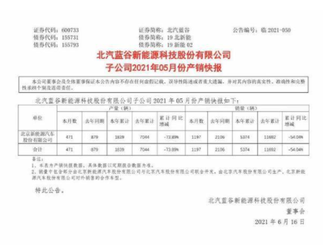數(shù)據(jù)顯示,北汽藍谷旗下北汽新能源汽車股份有限公司5月份共計銷售1197輛新車,相比去年同期2106輛的銷量下滑約43.2%。