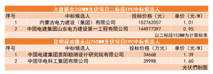 中國(guó)儲(chǔ)能網(wǎng)迅:6月18日,大唐新余250MW光伏項(xiàng)目二標(biāo)段與昆明祿勸撒永山250MW光伏項(xiàng)目?jī)蓚€(gè)項(xiàng)目公布了EPC中標(biāo)候選人。內(nèi)蒙古電力建設(shè)(集團(tuán))有限公司以投標(biāo)總價(jià)152762057元,單價(jià)1.01元/W成為大唐新余250MW光伏項(xiàng)目二標(biāo)段的第一中標(biāo)候選人;中國(guó)電建集團(tuán)貴陽(yáng)勘測(cè)設(shè)計(jì)研究院有限公司則以投標(biāo)價(jià)格34668萬(wàn)元,單價(jià)1.39元/W位列昆明祿勸撒永山250MW光伏項(xiàng)目的第一中標(biāo)候選人。