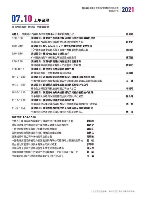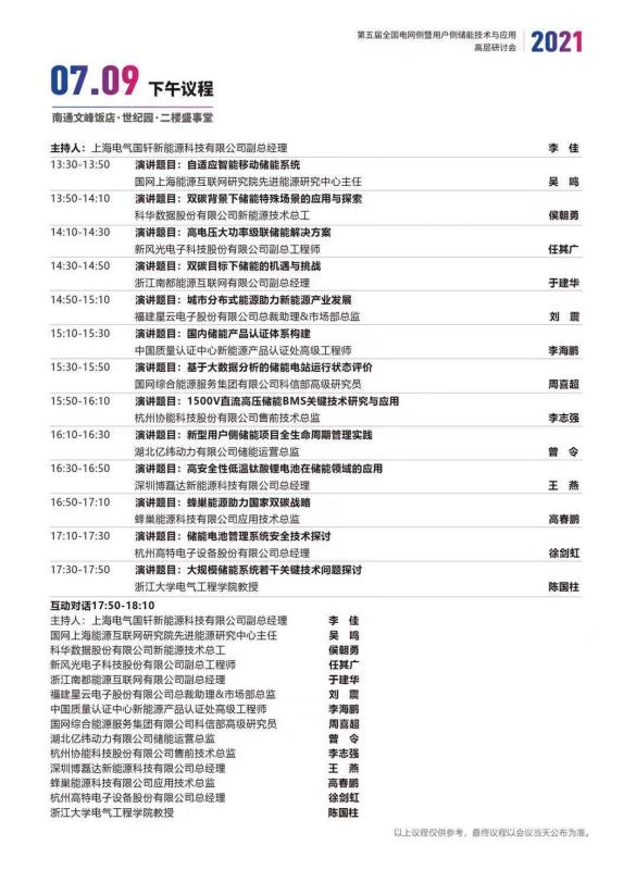 中國儲(chǔ)能網(wǎng)訊:為進(jìn)一步探討在電網(wǎng)側(cè)及用戶側(cè)建設(shè)儲(chǔ)能電站,緩解高峰負(fù)荷對(duì)電網(wǎng)的沖擊,同時(shí)探索平滑新能源和調(diào)頻輔助服務(wù)等應(yīng)用模式,提升項(xiàng)目運(yùn)行經(jīng)濟(jì)性,中國化學(xué)與物理電源行業(yè)協(xié)會(huì)儲(chǔ)能應(yīng)用分會(huì)決定聯(lián)合江蘇省電機(jī)工程學(xué)會(huì)、中國能源建設(shè)集團(tuán)江蘇省電力設(shè)計(jì)院有限公司等單位于2021年7月9—10日在江蘇省南通市文峰酒店召開“第五屆全國電網(wǎng)側(cè)暨用戶側(cè)儲(chǔ)能技術(shù)應(yīng)用高層研討會(huì)”,具體議程如下(最終議程以活動(dòng)當(dāng)天發(fā)布為準(zhǔn)):