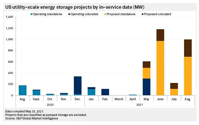 S&P Global Market Intelligence的數(shù)據(jù)顯示,如果開發(fā)商和公用事業(yè)公司的計劃獲得成功,截至今年8月份,美國公用事業(yè)規(guī)模的儲能總裝機容量(不包括常規(guī)抽水蓄能電站)同比增長185%,至5582MW。