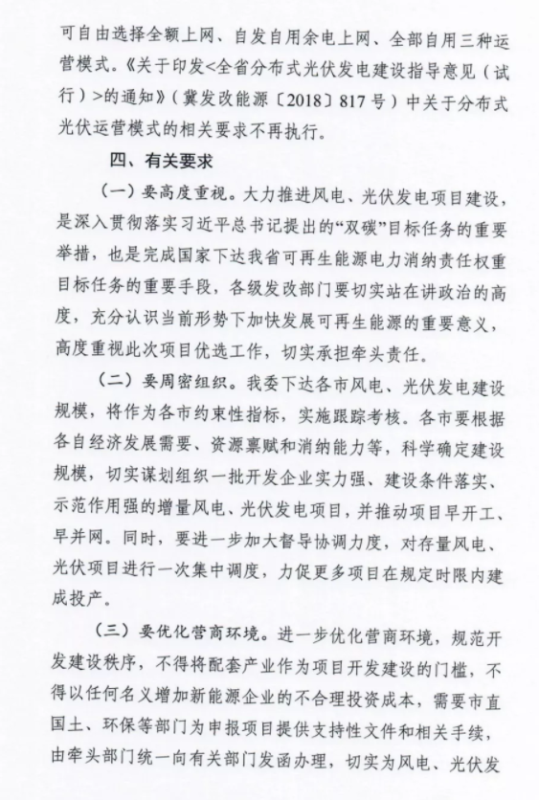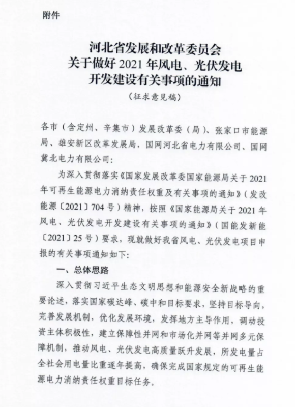 中國儲(chǔ)能網(wǎng)訊:近日,河北省發(fā)改委印發(fā)《關(guān)于做好2021年風(fēng)電、光伏發(fā)電開發(fā)建設(shè)有關(guān)事項(xiàng)的通知》(征求意見稿),就2021年河北省風(fēng)電、光伏保障性并網(wǎng)和市場(chǎng)化并網(wǎng)項(xiàng)目管理給出相關(guān)意見。