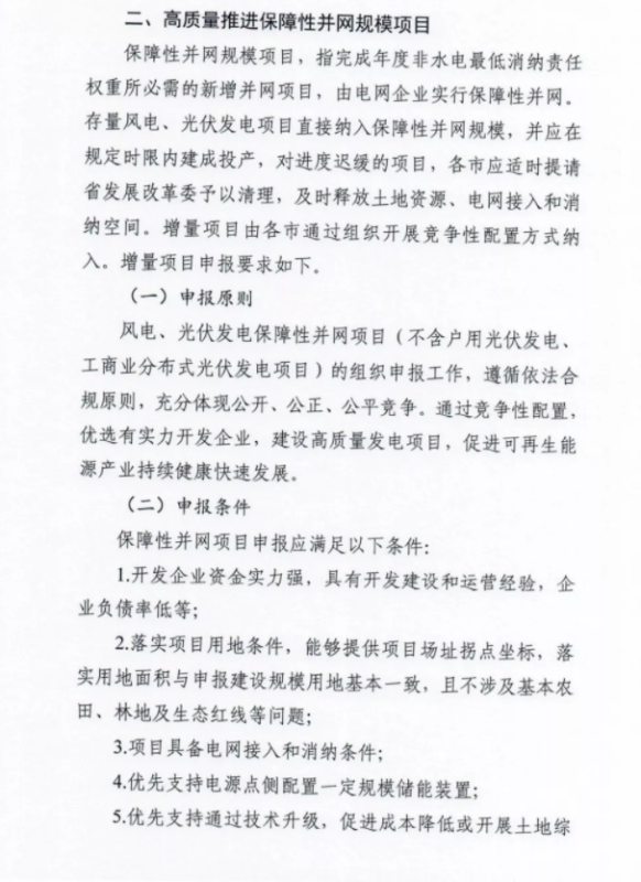 在保障性項(xiàng)目申報(bào)方面,資金實(shí)力強(qiáng)、負(fù)債率低的企業(yè)優(yōu)先;需落實(shí)項(xiàng)目用地,提供拐點(diǎn)坐標(biāo)且項(xiàng)目規(guī)模與用地面積相匹配;支持電源點(diǎn)配置儲(chǔ)能的項(xiàng)目優(yōu)先;優(yōu)先通過以技術(shù)降低土地成本或提高土地利用率的示范項(xiàng)目。