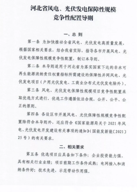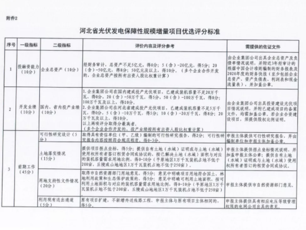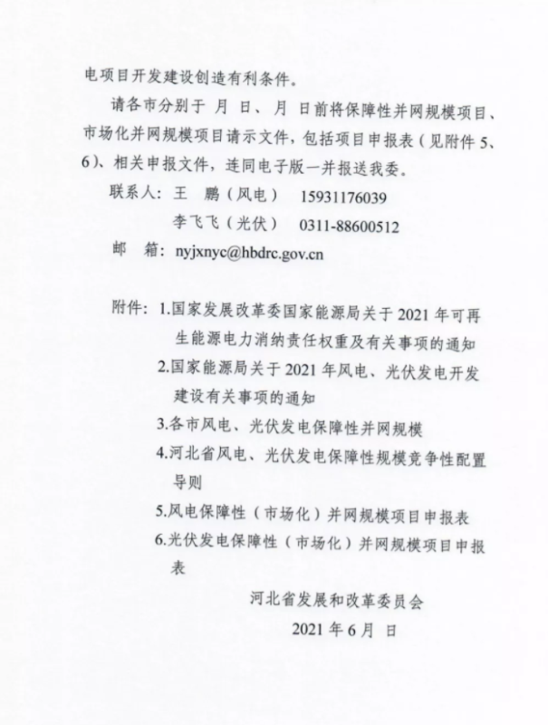 根據(jù)文件,河北省存量風(fēng)、光項(xiàng)目可直接納入保障性并網(wǎng)規(guī)模,新增并網(wǎng)的保障性并網(wǎng)項(xiàng)目需要競(jìng)爭(zhēng)性配置組織優(yōu)選項(xiàng)目。為完成2021年非水電最低消納責(zé)任,光伏保障性并網(wǎng)項(xiàng)目規(guī)模為11GW,涉及11個(gè)市區(qū);風(fēng)電保障性并網(wǎng)規(guī)模為5GW,僅允許承德與張家口申報(bào)。即2021年河北省風(fēng)電、光伏保障性并網(wǎng)項(xiàng)目規(guī)模為16GW,戶用與分布式光伏則不包含在內(nèi)。