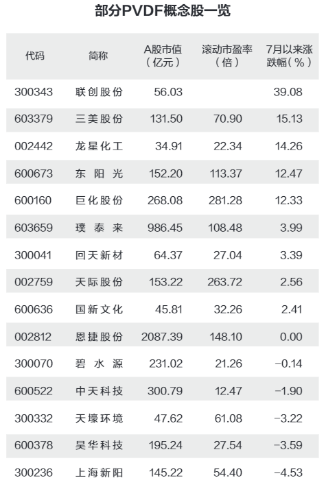 證券時(shí)報(bào)·數(shù)據(jù)寶梳理A股PVDF概念股,合計(jì)有15只。從市值角度來看,龍星化工、三美股份、聯(lián)創(chuàng)股份、天壕環(huán)境、國新文化等個(gè)股最新A股流通市值均低于50億元,流通市值最高的是恩捷股份,超過1400億元。此外,璞泰來流通市值近千億元,中天科技、巨化股份、碧水源等個(gè)股市值均超過百億元。