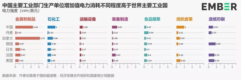電力消費結(jié)構(gòu)是導(dǎo)致中國電力強度偏高的一個重要原因。在中國,電力大約70%被工業(yè)部門使用,20%流入商業(yè)服務(wù)業(yè),10%為居民用電。在其它主要工業(yè)國,三者的份額大約一樣。與工業(yè)相比,商業(yè)服務(wù)業(yè)生產(chǎn)單位增加值所用電力消費更小,而中國工業(yè)特別是高耗能的化工和金屬冶煉壓延加工業(yè),在電力消費結(jié)構(gòu)中占比偏大,導(dǎo)致電力強度偏高。此外,中國主要工業(yè)部門生產(chǎn)單位增加值電力消費量均不同程度上高于世界主要工業(yè)國。這意味著一些工業(yè)產(chǎn)能技術(shù)落后,生產(chǎn)過程中用電效率不高,也是造成電力強度偏高的一個因素。