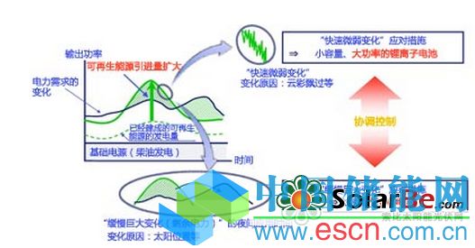光伏和風(fēng)力發(fā)電輸出功率的變化分為云彩飄過等日照量變化,風(fēng)速變化帶來的“快速微弱變化”(短周期變化),以及太陽位置變化等帶來的“緩慢巨大變化”(長周期變化,剩余電力)。離島一般是利用柴油發(fā)電機(jī)來調(diào)節(jié)輸出功率的變化,但隨著可再生能源引進(jìn)量的大幅增加,調(diào)節(jié)能力將出現(xiàn)缺口,要想進(jìn)一步擴(kuò)大改進(jìn),就必須活用蓄電池調(diào)節(jié)輸出功率的變化。