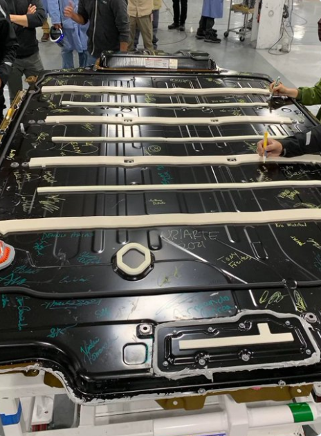好在來自Whole Cars Catalog的爆料顯示,4680電池組已經(jīng)在特斯拉工廠投產(chǎn)了,圖片顯示,特斯拉員工們甚至在一塊結(jié)構化的電池組上簽名,表達興奮之情。