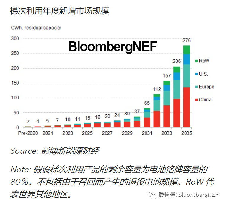 未來,梯次利用的商業(yè)化應(yīng)用前景將取決于用戶在低成本和電池性能衰減之間如何進(jìn)行權(quán)衡和選擇。彭博新能源財經(jīng)估計,針對儲能場景,退役動力電池如若剩余使用壽命仍高于3,000次且成本降至30美元/kWh以下,才能在LCOE方面具備與新電池相當(dāng)?shù)母偁幜ΑR虼颂荽卫酶m合無需頻繁充放電、對能量密度和系統(tǒng)集成度要求不高的應(yīng)用領(lǐng)域,如備用電源等。