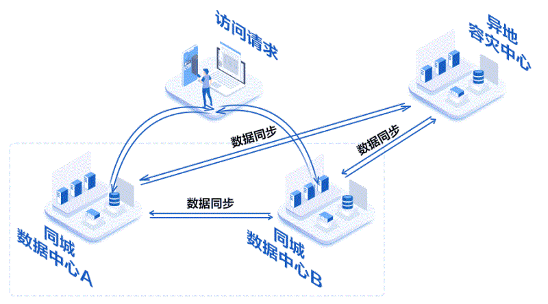 雙活數(shù)據(jù)中心解決方案一般都部署在同一個城市,但是由于大范圍網(wǎng)絡(luò)故障、自然災(zāi)害等一些不可抗力因素的存在,會出現(xiàn)兩個數(shù)據(jù)中心同時(shí)無法對外提供服務(wù)的情況。為了保障更高的業(yè)務(wù)連續(xù)性,衍生出了“兩地三中心解決方案”,即:同城數(shù)據(jù)中心A+同城數(shù)據(jù)中心B+異地容災(zāi)中心。同城數(shù)據(jù)中心是指在同城建立兩個可獨(dú)立承載業(yè)務(wù)運(yùn)行的數(shù)據(jù)中心,雙中心具備等同的業(yè)務(wù)處理能力并通過高速鏈路實(shí)時(shí)同步數(shù)據(jù)。異地容災(zāi)中心是指在異地(一般在200KM范圍外) 建立一個備份的災(zāi)備中心,用于雙中心的數(shù)據(jù)備份。以確保在同城數(shù)據(jù)中心同時(shí)出現(xiàn)問題的情況下,異地容災(zāi)中心可不間斷對外提供服務(wù)。目前這種方案在金融行業(yè)應(yīng)用非常廣泛。