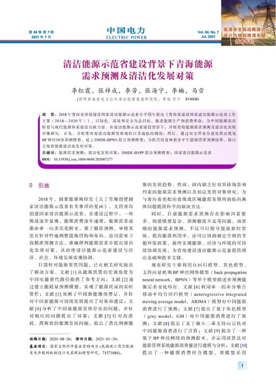 李紅霞, 張祥成, 李芳, 等. 清潔能源示范省建設(shè)背景下青海能源需求預(yù)測(cè)及清潔化發(fā)展對(duì)策[J]. 中國(guó)電力, 2021, 54(7): 1-10, 26.