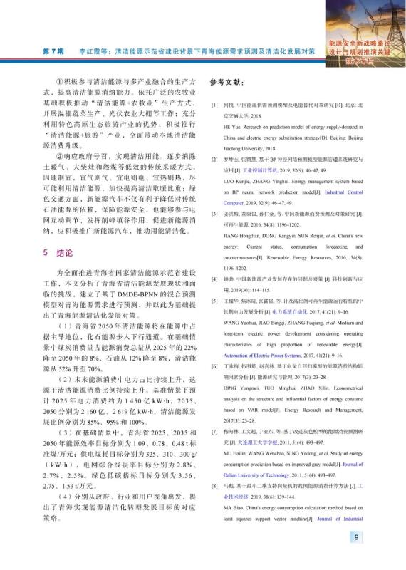 結(jié)論:為全面推進(jìn)青海省國(guó)家清潔能源示范省建設(shè)工作,本文分析了青海省清潔能源發(fā)展現(xiàn)狀和面臨的挑戰(zhàn),建立了基于DMDE-BPNN的混合預(yù)測(cè)模型對(duì)青海能源需求進(jìn)行預(yù)測(cè),并以此為基礎(chǔ)提出了青海能源清潔化發(fā)展對(duì)策。