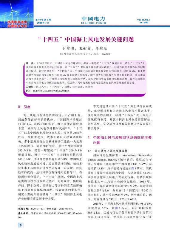 SHI Zhiyong, WANG Caixia, LI Qionghui. Key issues of china's offshore wind power development in the “14th five-year plan”[J]. Electric Power, 2020, 53(7): 8-17.