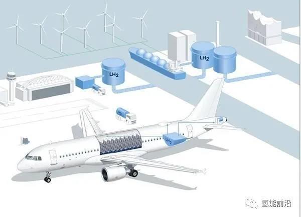 圖說:液態(tài)氫可能將被應(yīng)用于未來飛機(jī)(藍(lán)色箭頭)和機(jī)場(chǎng)(地面車輛)及其周邊(燃料儲(chǔ)存設(shè)備)。藍(lán)色箭頭指向的是飛機(jī)上的潛在應(yīng)用領(lǐng)域:例如可以使用燃料電池為衛(wèi)星通信以及廚房、客艙或IFE系統(tǒng)提供電力 漢堡駐上海聯(lián)絡(luò)處供圖