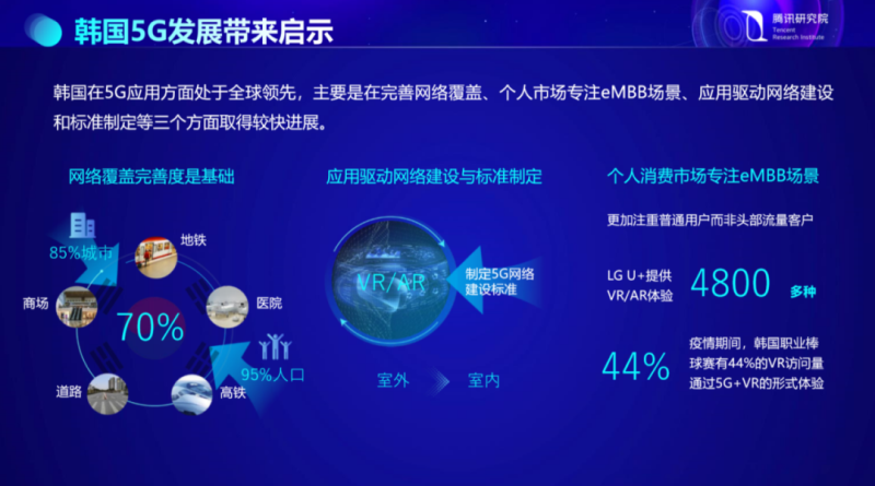 1.專注個人消費市場推動5G快速普及。在5G普及過程中,韓國電信運營商在初期重點聚焦在個人消費市場的eMBB場景,通過提供大帶寬能力為豐富的VR/AR應用落地奠定基礎。例如韓國電信運營商LG U+為用戶提供360度觀看棒球選手揮桿特寫鏡頭,通過實時擊球區(qū)用戶可以身臨其境感受運動員擊球瞬間。同時在多頻、多視角直播方面用戶可以同時觀看5場棒球聯(lián)賽直播。在酒店里提供15種VR游戲和超過1300種VR視頻供用戶選擇,涉及體育比賽、娛樂、在線教育等諸多內容。和網(wǎng)絡漫畫工作室推出“明星AR/VR”內容吸引粉絲與明星“在一起”的實時感受。與韓國偶像EXO打造XR線上音樂會,成為后疫情時代線下演唱會的有效替代方案。根據(jù)過往經(jīng)驗,用戶滲透率超過20%將達到技術應用爆發(fā)的臨界點,VR/AR有望成為韓國5G個人用戶的殺手級應用。