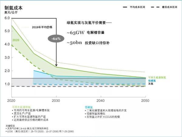 圖2:各類技術(shù)路線制氫成本(包含碳排成本)趨勢預(yù)測綜上所述,對比2020年國際氫能委員會的預(yù)測,以上這些因素將共同推動綠氫成本預(yù)測曲線在平均成本區(qū)間降低20%,在最佳成本區(qū)間降低30%。