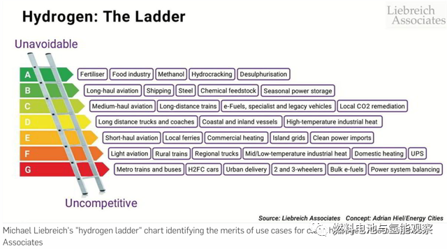 為了引導(dǎo)政府和工業(yè)界的相關(guān)方擺脫認(rèn)知困境,雷布里奇創(chuàng)造了一個他稱之為“氫梯”的簡單圖表,顯示了在哪些部門使用氫能是沒有競爭力的,哪些部門使用氫能對于脫碳是不可避免的。在這個氫能階梯的頂端( “不可避免”的氫能用途)可以看到氨基化肥和煉油,目前使用化石燃料造成了全球3-4%的碳排放。氫能在季節(jié)性電力儲存、鋼鐵、化工、航運和長途航空(使用液態(tài)氫或從氫氣中提取的合成燃料)也處于這個階梯比較靠上部的地位。